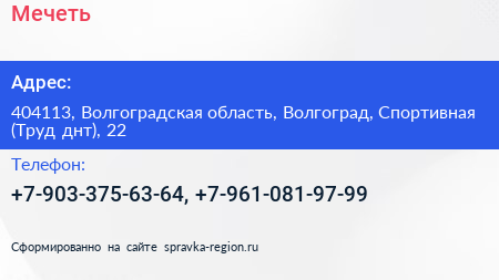 Мечеть по адресу 404113, Волгоградская область, Волгоград, Спортивная (Труд днт), 22 в дальнейшем Организация, размещена в следующих категориях: