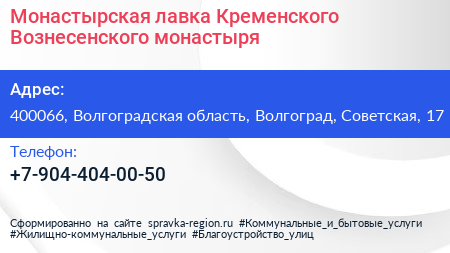 Монастырская лавка Кременского-Вознесенского монастыря по адресу 400066, Волгоградская область, Волгоград, Советская, 17 в дальнейшем Организация, размещена в следующих категориях: