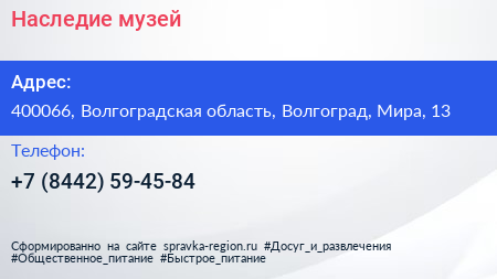 Наследие, музей по адресу 400066, Волгоградская область, Волгоград, Мира, 13 в дальнейшем Организация, размещена в следующих категориях: