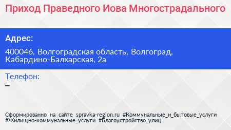 Приход Праведного Иова Многострадального по адресу 400046, Волгоградская область, Волгоград, Кабардино-Балкарская, 2а в дальнейшем Организация, размещена в следующих категориях: