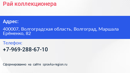 Рай коллекционера по адресу 400007, Волгоградская область, Волгоград, Маршала Ерёменко, 82 в дальнейшем Организация, размещена в следующих категориях: