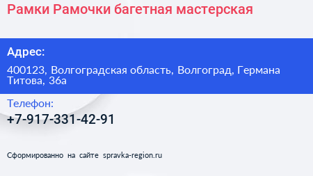 Рамки & Рамочки, багетная мастерская по адресу 400123, Волгоградская область, Волгоград, Германа Титова, 36а в дальнейшем Организация, размещена в следующих категориях: