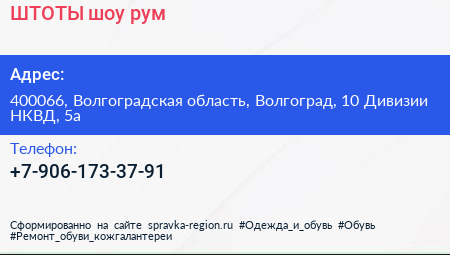 ШТОТЫ, шоу-рум по адресу 400066, Волгоградская область, Волгоград, 10 Дивизии НКВД, 5а в дальнейшем Организация, размещена в следующих категориях: