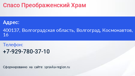 Спасо-Преображенский Храм по адресу 400137, Волгоградская область, Волгоград, Космонавтов, 16 в дальнейшем Организация, размещена в следующих категориях: