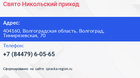 Свято-Никольский приход по адресу 404160, Волгоградская область, Волгоград, Тимирязевская, 70 в дальнейшем Организация, размещена в следующих категориях: