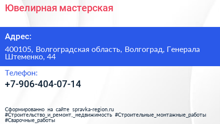 Ювелирная мастерская по адресу 400105, Волгоградская область, Волгоград, Генерала Штеменко, 44 в дальнейшем Организация, размещена в следующих категориях: