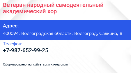 Ветеран, народный самодеятельный академический хор по адресу 400094, Волгоградская область, Волгоград, Савкина, 8 в дальнейшем Организация, размещена в следующих категориях: