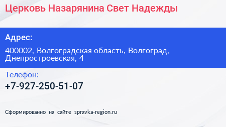 Церковь Назарянина Свет Надежды по адресу 400002, Волгоградская область, Волгоград, Днепростроевская, 4 в дальнейшем Организация, размещена в следующих категориях: