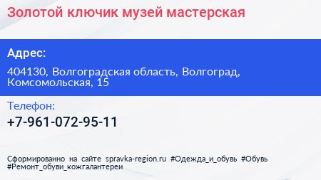 Золотой ключик, музей-мастерская по адресу 404130, Волгоградская область, Волгоград, Комсомольская, 15 в дальнейшем Организация, размещена в следующих категориях: