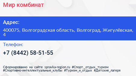 Мир, комбинат по адресу 400075, Волгоградская область, Волгоград, Жигулёвская, 4 в дальнейшем Организация, размещена в следующих категориях: