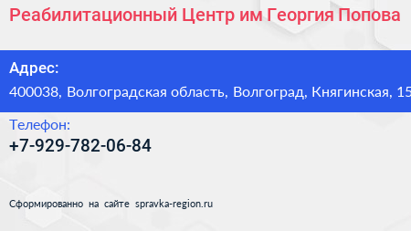 Реабилитационный Центр им. Георгия Попова по адресу 400038, Волгоградская область, Волгоград, Княгинская, 15 в дальнейшем Организация, размещена в следующих категориях: