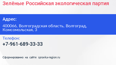 Зелёные, Российская экологическая партия по адресу 400066, Волгоградская область, Волгоград, Комсомольская, 3 в дальнейшем Организация, размещена в следующих категориях: