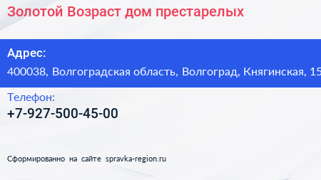 Золотой Возраст, дом престарелых по адресу 400038, Волгоградская область, Волгоград, Княгинская, 15 в дальнейшем Организация, размещена в следующих категориях: