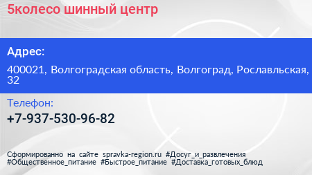 5колесо, шинный центр по адресу 400021, Волгоградская область, Волгоград, Рославльская, 32 в дальнейшем Организация, размещена в следующих категориях:
