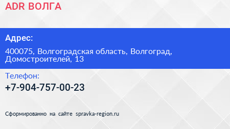ADR ВОЛГА по адресу 400075, Волгоградская область, Волгоград, Домостроителей, 13 в дальнейшем Организация, размещена в следующих категориях: