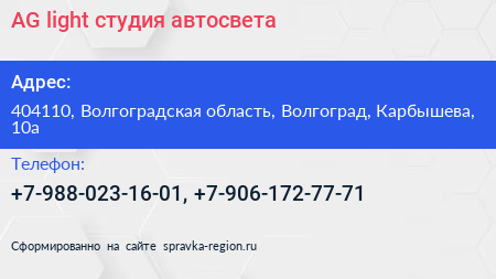 AG light, студия автосвета по адресу 404110, Волгоградская область, Волгоград, Карбышева, 10а в дальнейшем Организация, размещена в следующих категориях: