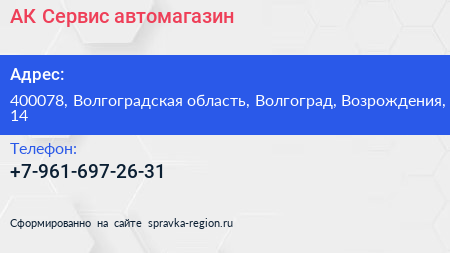АК-Сервис, автомагазин по адресу 400078, Волгоградская область, Волгоград, Возрождения, 14 в дальнейшем Организация, размещена в следующих категориях: