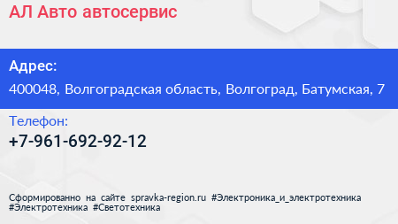 АЛ-Авто, автосервис по адресу 400048, Волгоградская область, Волгоград, Батумская, 7 в дальнейшем Организация, размещена в следующих категориях: