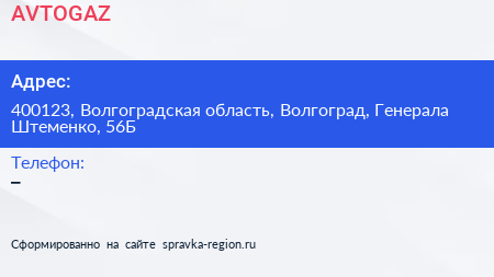 AVTOGAZ по адресу 400123, Волгоградская область, Волгоград, Генерала Штеменко, 56Б в дальнейшем Организация, размещена в следующих категориях: