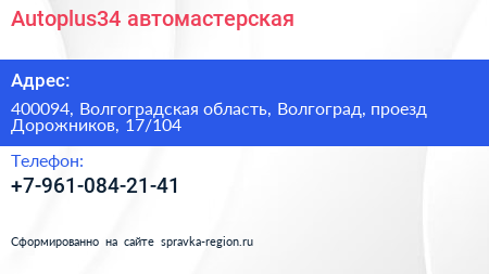Autoplus34, автомастерская по адресу 400094, Волгоградская область, Волгоград, проезд Дорожников, 17/104 в дальнейшем Организация, размещена в следующих категориях: