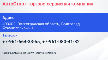 АвтоСтарт, торгово-сервисная компания по адресу 400002, Волгоградская область, Волгоград, Суровикинская, 9 в дальнейшем Организация, размещена в следующих категориях: