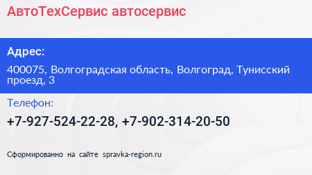 АвтоТехСервис, автосервис по адресу 400075, Волгоградская область, Волгоград, Тунисский проезд, 3 в дальнейшем Организация, размещена в следующих категориях:
