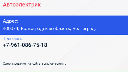 Автоэлектрик по адресу 400074, Волгоградская область, Волгоград, в дальнейшем Организация, размещена в следующих категориях: