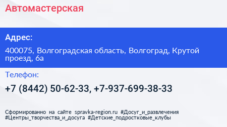 Автомастерская по адресу 400075, Волгоградская область, Волгоград, Крутой проезд, 6а в дальнейшем Организация, размещена в следующих категориях: