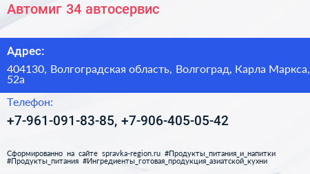 Автомиг 34, автосервис по адресу 404130, Волгоградская область, Волгоград, Карла Маркса, 52а в дальнейшем Организация, размещена в следующих категориях: