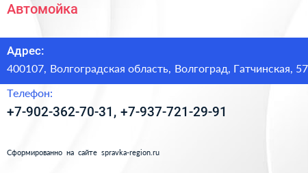 Автомойка по адресу 400107, Волгоградская область, Волгоград, Гатчинская, 57 в дальнейшем Организация, размещена в следующих категориях: