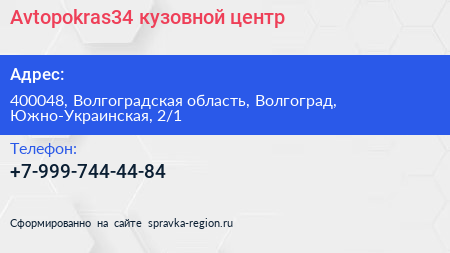 Avtopokras34, кузовной центр по адресу 400048, Волгоградская область, Волгоград, Южно-Украинская, 2/1 в дальнейшем Организация, размещена в следующих категориях: