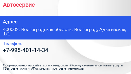 Автосервис по адресу 400002, Волгоградская область, Волгоград, Адыгейская, 1/1 в дальнейшем Организация, размещена в следующих категориях: