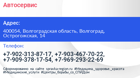 Автосервис по адресу 400054, Волгоградская область, Волгоград, Острогожская, 14 в дальнейшем Организация, размещена в следующих категориях: