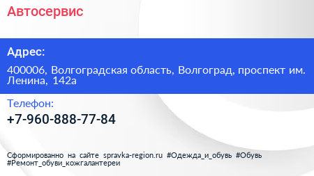 Автосервис по адресу 400006, Волгоградская область, Волгоград, проспект им. Ленина, 142а в дальнейшем Организация, размещена в следующих категориях: