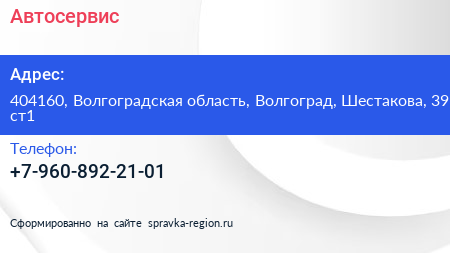 Автосервис по адресу 404160, Волгоградская область, Волгоград, Шестакова, 39 ст1 в дальнейшем Организация, размещена в следующих категориях: