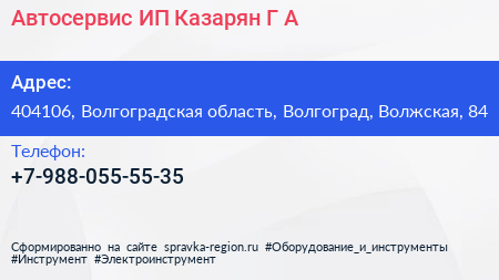 Автосервис, ИП Казарян Г.А. по адресу 404106, Волгоградская область, Волгоград, Волжская, 84 в дальнейшем Организация, размещена в следующих категориях: