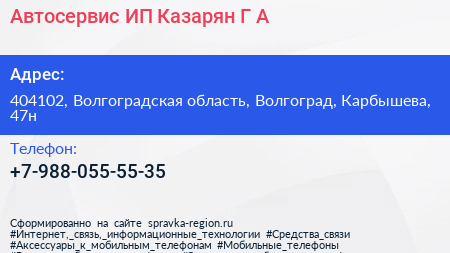 Автосервис, ИП Казарян Г.А. по адресу 404102, Волгоградская область, Волгоград, Карбышева, 47н в дальнейшем Организация, размещена в следующих категориях: