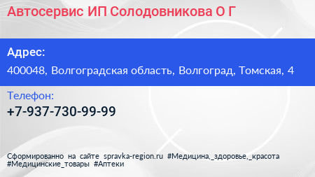 Автосервис, ИП Солодовникова О.Г. по адресу 400048, Волгоградская область, Волгоград, Томская, 4 в дальнейшем Организация, размещена в следующих категориях: