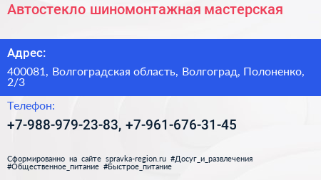 Автостекло, шиномонтажная мастерская по адресу 400081, Волгоградская область, Волгоград, Полоненко, 2/3 в дальнейшем Организация, размещена в следующих категориях: