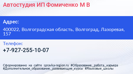 Автостудия, ИП Фомиченко М.В. по адресу 400022, Волгоградская область, Волгоград, Лазоревая, 157 в дальнейшем Организация, размещена в следующих категориях: