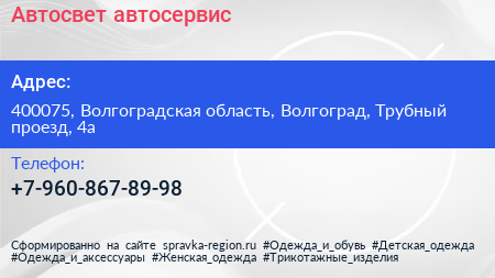 Автосвет, автосервис по адресу 400075, Волгоградская область, Волгоград, Трубный проезд, 4а в дальнейшем Организация, размещена в следующих категориях: