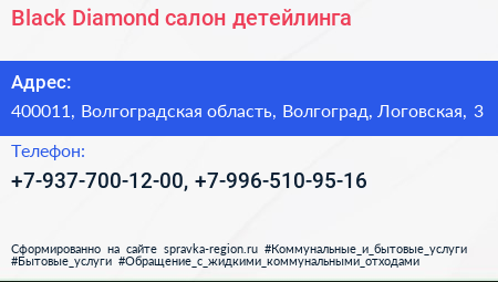 Black Diamond, салон детейлинга по адресу 400011, Волгоградская область, Волгоград, Логовская, 3 в дальнейшем Организация, размещена в следующих категориях: