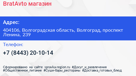 BratAvto, магазин по адресу 404106, Волгоградская область, Волгоград, проспект Ленина, 239 в дальнейшем Организация, размещена в следующих категориях: