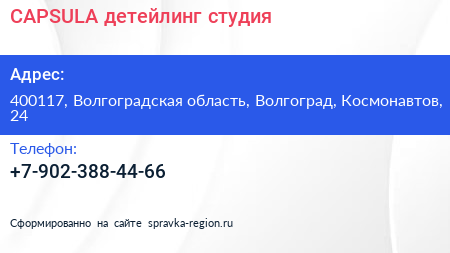 CAPSULA, детейлинг-студия по адресу 400117, Волгоградская область, Волгоград, Космонавтов, 24 в дальнейшем Организация, размещена в следующих категориях: