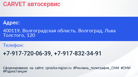 CARVET, автосервис по адресу 400119, Волгоградская область, Волгоград, Льва Толстого, 120 в дальнейшем Организация, размещена в следующих категориях: