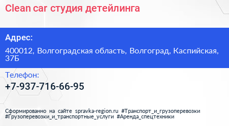 Clean car, студия детейлинга по адресу 400012, Волгоградская область, Волгоград, Каспийская, 37Б в дальнейшем Организация, размещена в следующих категориях: