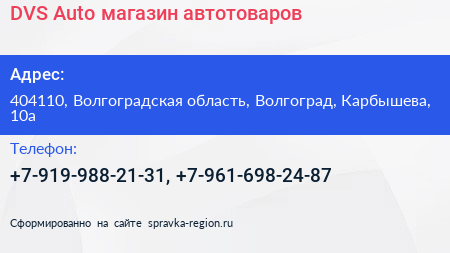 DVS Auto, магазин автотоваров по адресу 404110, Волгоградская область, Волгоград, Карбышева, 10а в дальнейшем Организация, размещена в следующих категориях: