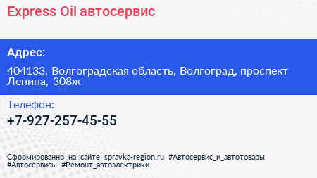 Express Oil, автосервис по адресу 404133, Волгоградская область, Волгоград, проспект Ленина, 308ж в дальнейшем Организация, размещена в следующих категориях: