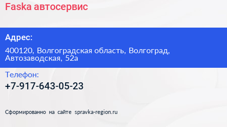 Faska, автосервис по адресу 400120, Волгоградская область, Волгоград, Автозаводская, 52а в дальнейшем Организация, размещена в следующих категориях: