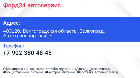 Форд34, автосервис по адресу 400120, Волгоградская область, Волгоград, Автотранспортная, 7 в дальнейшем Организация, размещена в следующих категориях: